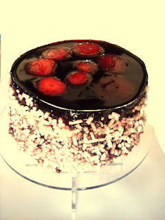 Io ho spennellato la superficie del dolce con della marmellata ai frutti di bosco, ho aggiunto per decorare una spirale di fette di fragole e ho ricoperto con il liquido gelatinoso.