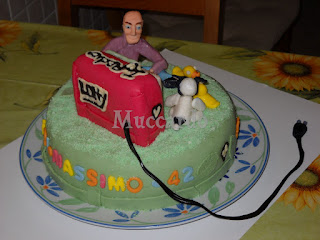 Pandispagna da 1 uovo cotto in uno stampo rettangolare monoporzione e ritagliato ad hoc, farcito anch’esso con le due creme, rivestito di MMF rosso, e addobbato come fosse una radio: c’è la griglia dell’altoparlante (un wafer al cioccolato), il visore delle frequenze (una caramella alla menta sciolta a lastra al microonde) su cui ho segnato con del cioccolato fuso le frequenze, il cavo dell’alimentazione (una rotella di liquirizia srotolata per simulare il cavo elettrico) con la sua bella presa di corrente (in MMF nero e grigio).