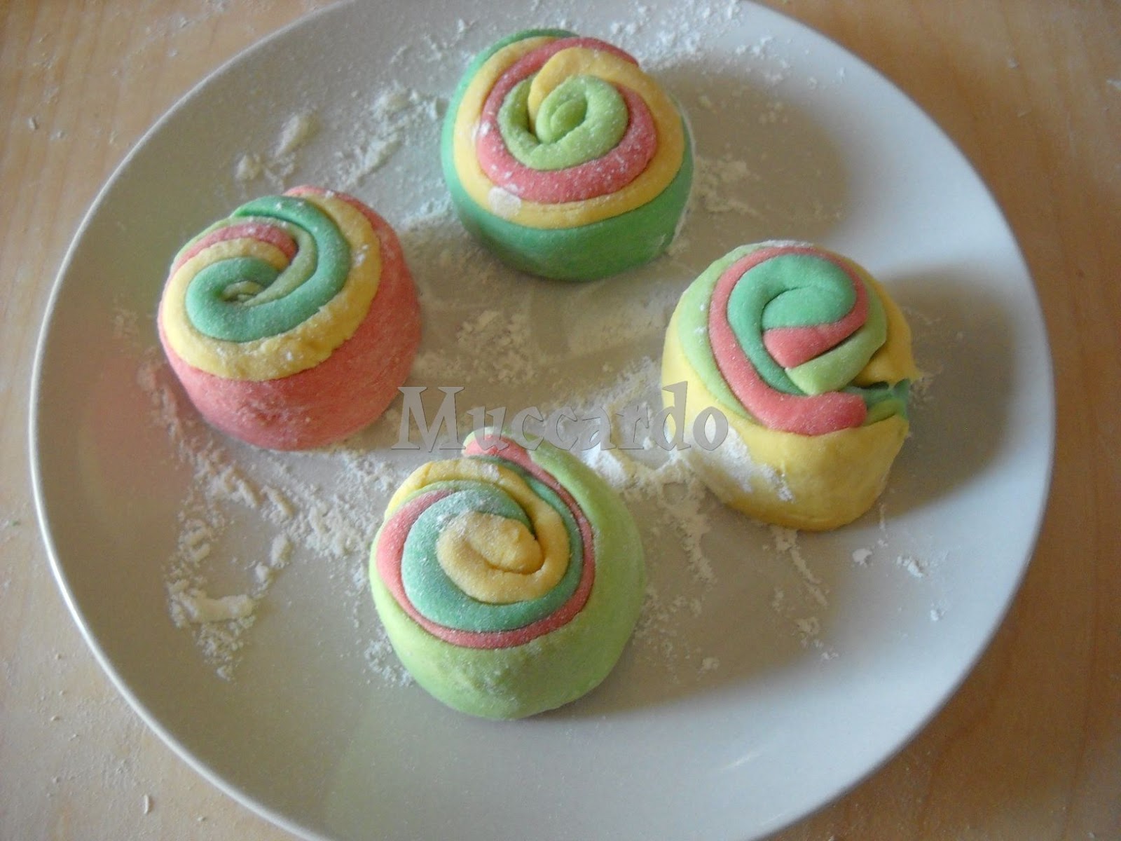Ho poi divisto ulteriormente ogni panetto colorato in quattro e ho formato delle strisce di circa 15 com di lunghezza, appiattendole un po'. Ho inumidito leggermente la superficie delle strisce e le ho sovrapposte alternando i colori in modo dverso per ogni panino.
