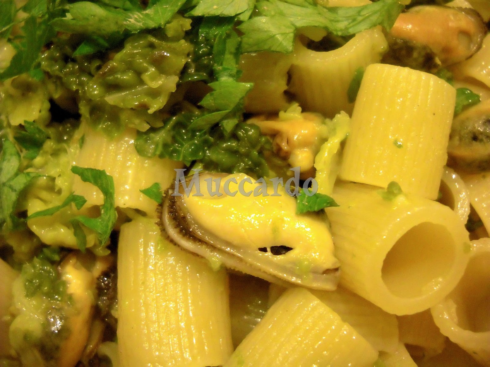 Quindi scolare i bombolotti, scatrafrombolalli* nella padellona dove giacciono assieme in tenero connubio la verza e le cozze, e far saltare per un paio di minuti.
