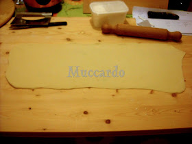 Si dovrà ottenere uno spessore mooolto sottile, e sarà la parte più laboriosa perché si dovrà ottenere un velo semitrasparente di pasta, su cui distribuire con le dita lo strutto ammorbidito a temperatura ambiente.