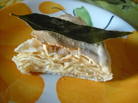 Coprire una piastra per il forno con le foglie d'alloro unte d'olio, stenderci sopra la sfoglia di farina ed acqua facendola penzolare e mettere sopra, al centro, una delle sfoglie di semola.